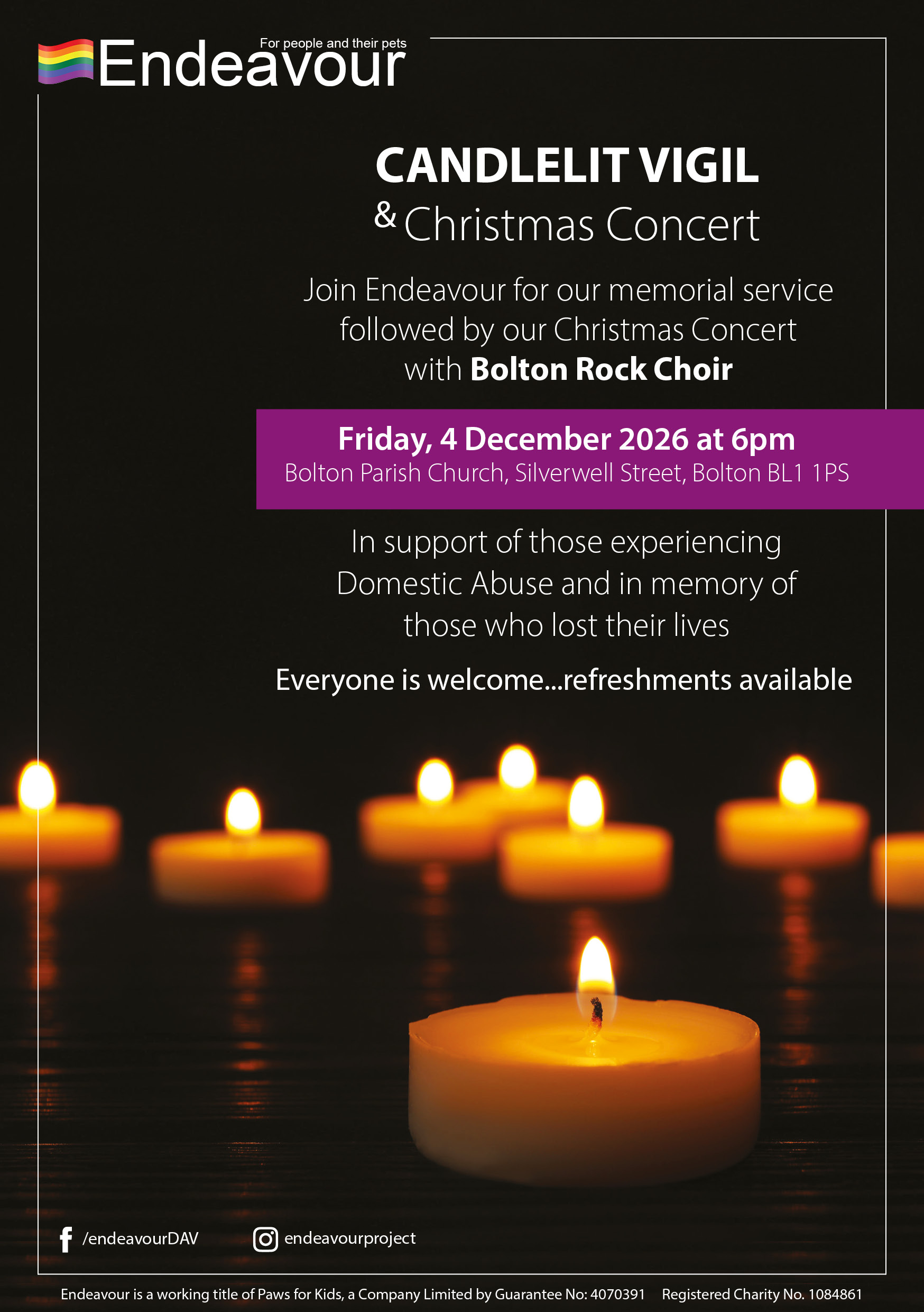 Join Endeavour at The Beautiful Bolton Parish Church for our annual Candle Lit Vigil. The evening comprises of readings and remembrance followed by entertainment by the brilliant Bolton Rock Choir.